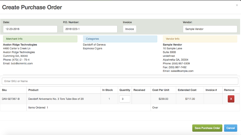 Cigar Inventory Management System made especially for cigar stores. Use Clover to manage your business. Easily break a box into multiple types (sample packs, singles, etc). Easily create Sample Packs (Kits). Purchase Order management that works directly with your inventory.